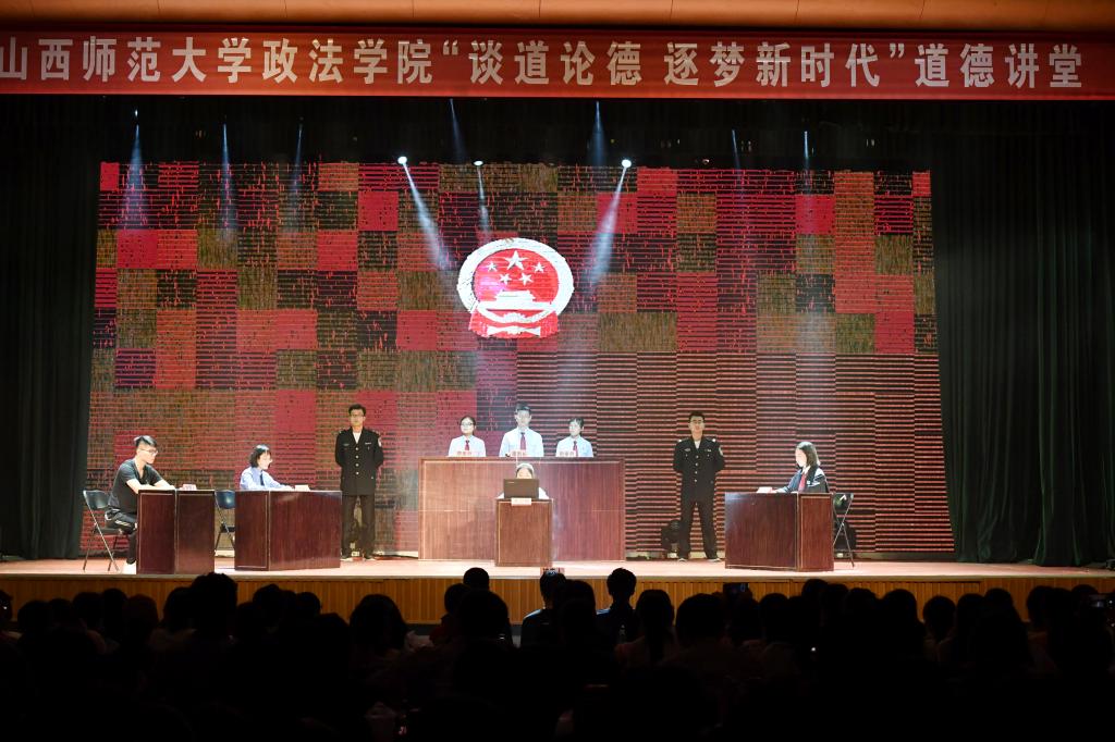 本场道德讲堂以“谈道论德,逐梦新时代”为主题,共分“古贤厚德一脉传”、“今人美德担道义”、“大国道德续新篇”三个篇章。讲堂在“模拟法庭进校园”中拉开帷幕,政法学院师生用模拟法庭判决案例的形式,生动再现了法庭审案场景。在讲堂第一篇章“古贤厚德一脉传”中,黄凯老师围绕《君子德行》引出了君子之风这一经久不衰的话题。在第二篇章“今人美德担道义”中,赵秀芳老师生动讲述了革命前辈们“为绝大多数人谋利益”的道德实践和道德力量,鼓励学生以大众利益为道德坐标,为绝大多数人谋利益。第三篇章“大国道德续新篇”由政法学院院长贾绘泽老师主讲,贾老师从坚守理想信念、勇于担当责任、践行社会主义核心价值观和树立奋斗幸福观四个方面作了题为《知行新时代道德,勇做新时代青年》的演讲,对新时代的青年提出了更高的道德要求和希望。随后,郝兴雅、张雯雯、张玉婷、杨海亮、何志华、黄凯老师深情朗诵《薪火相传风华正茂不忘初心砥砺前行》,节目铿锵激昂,深深感染了在场的观众,赢得现场阵阵掌声。最后,本次道德讲堂在于智华老师歌唱的《筑梦中国》中落下了帷幕。