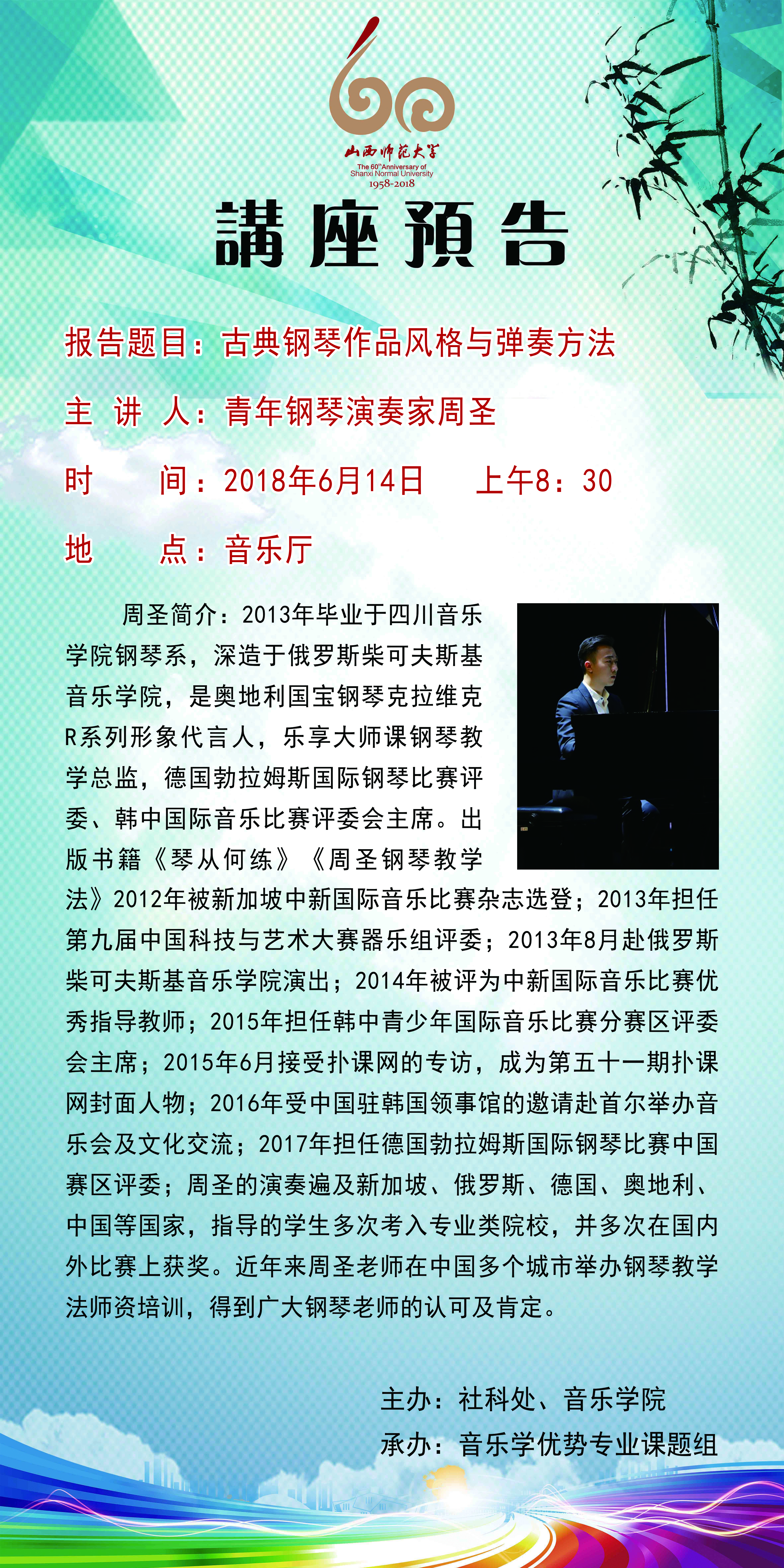 【预告】青年钢琴演奏家周圣老师应音乐学院邀请来我校作学术报告